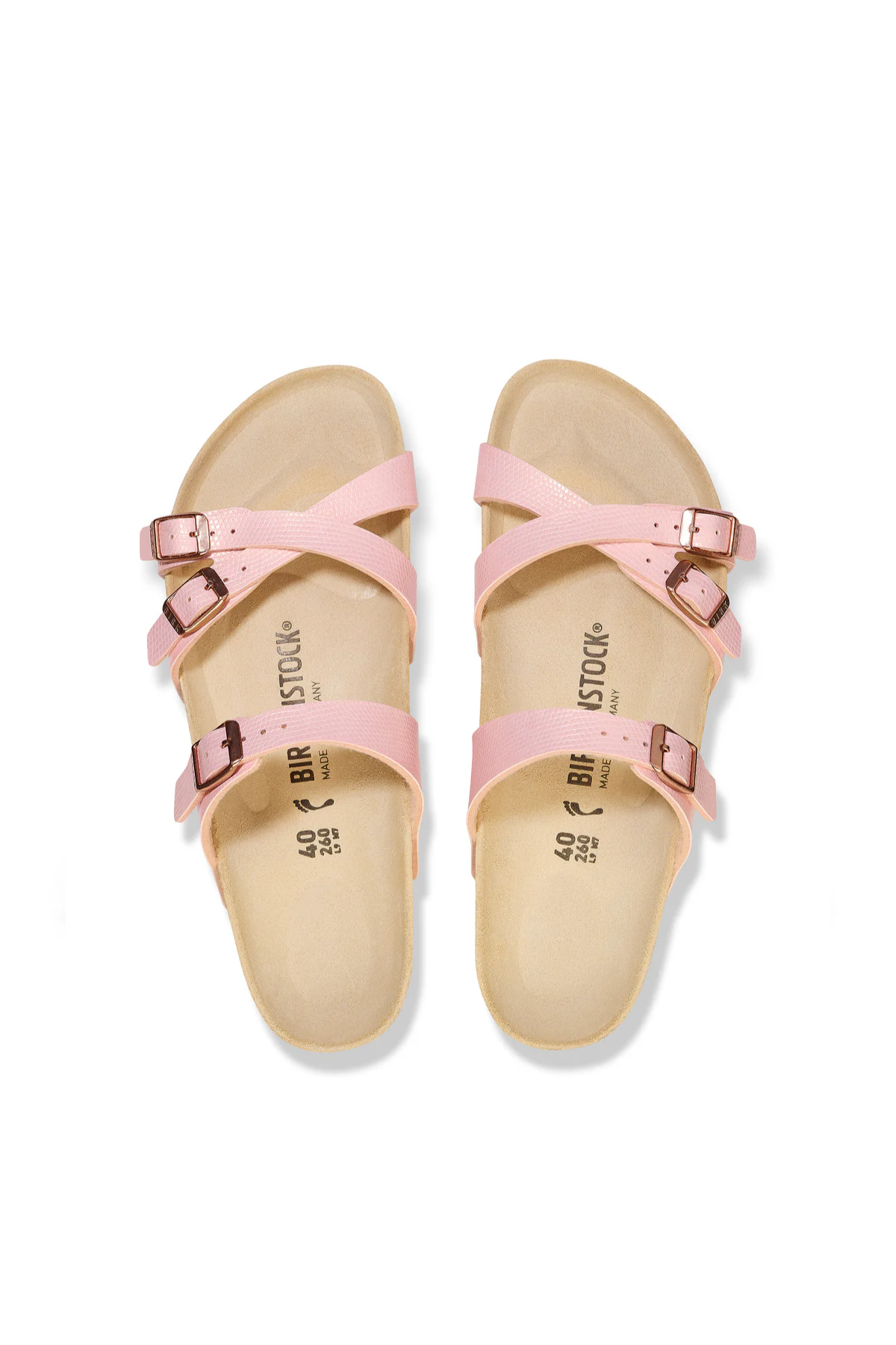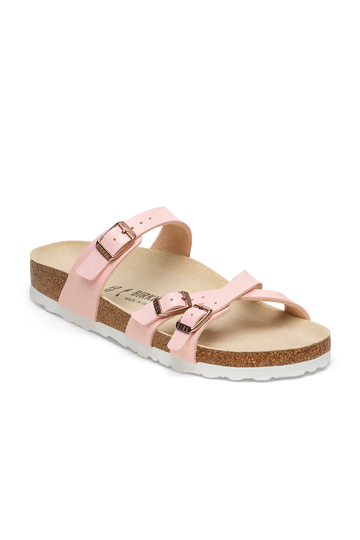 The Birkenstock Franca is an elegant model designed with slim, stylish crisscrossed straps. Featuring an impressive combination of design and wearability for all day comfort. Shimmery Birko-Flor embossed to look like snake-print, brings subtle dimension to the strappy style.